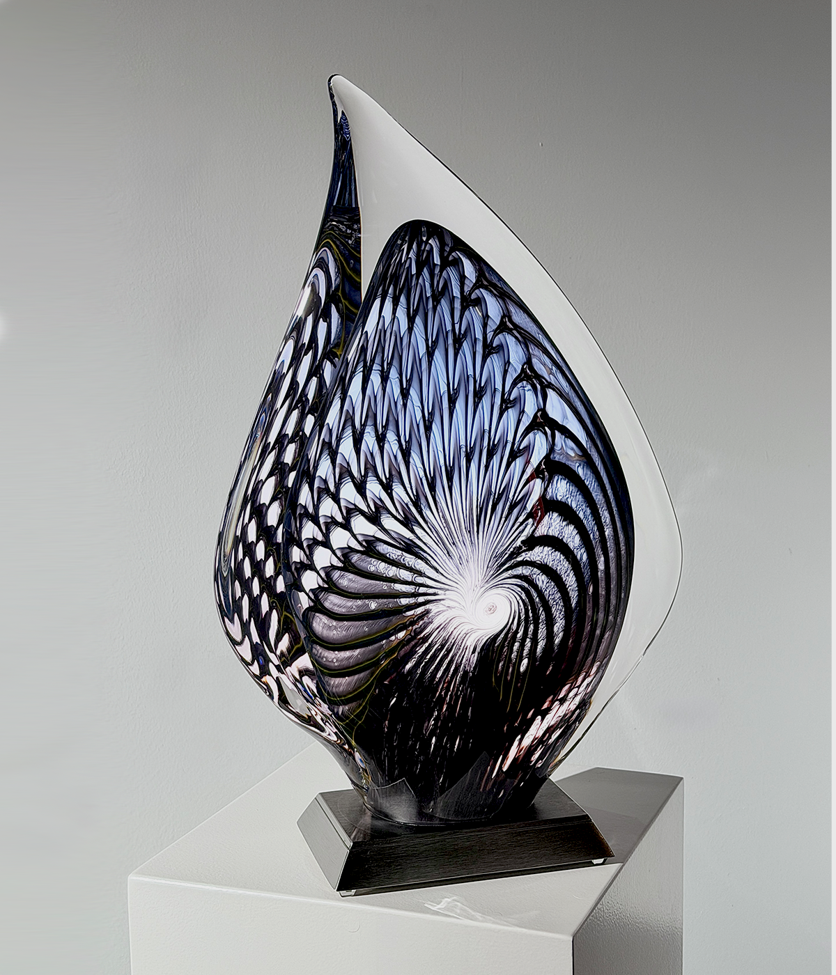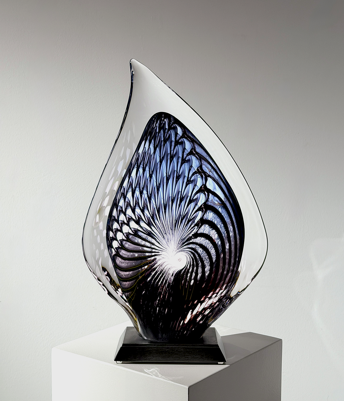 Center-Piece “FERA“, 2026, Unikat, betitelt, signiert, mundgeblasene Skulptur, (elektrisch) illuminiertes Glaselement, 3-Stufen dimmbar, verbunden mit einem Edelstahlsockel, totale Höhe 51 cm, ca. 11.9 kg, inkl. Echtheits-Zertifikat