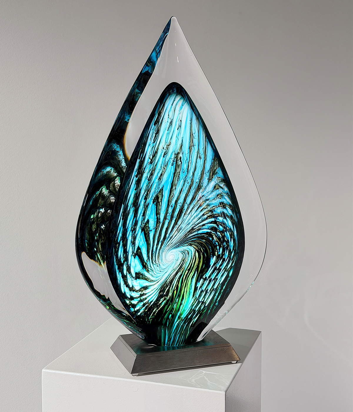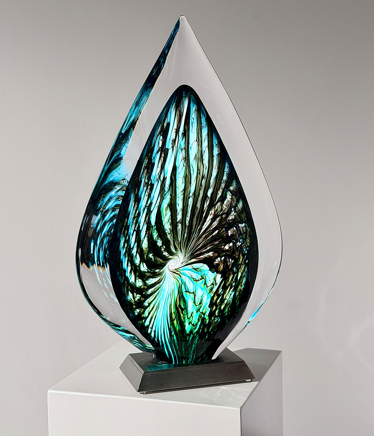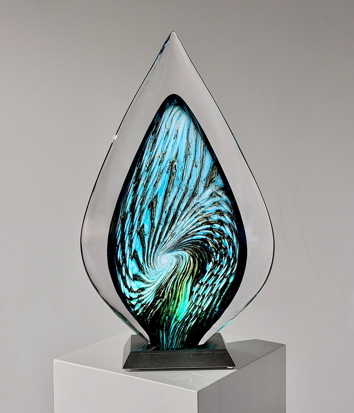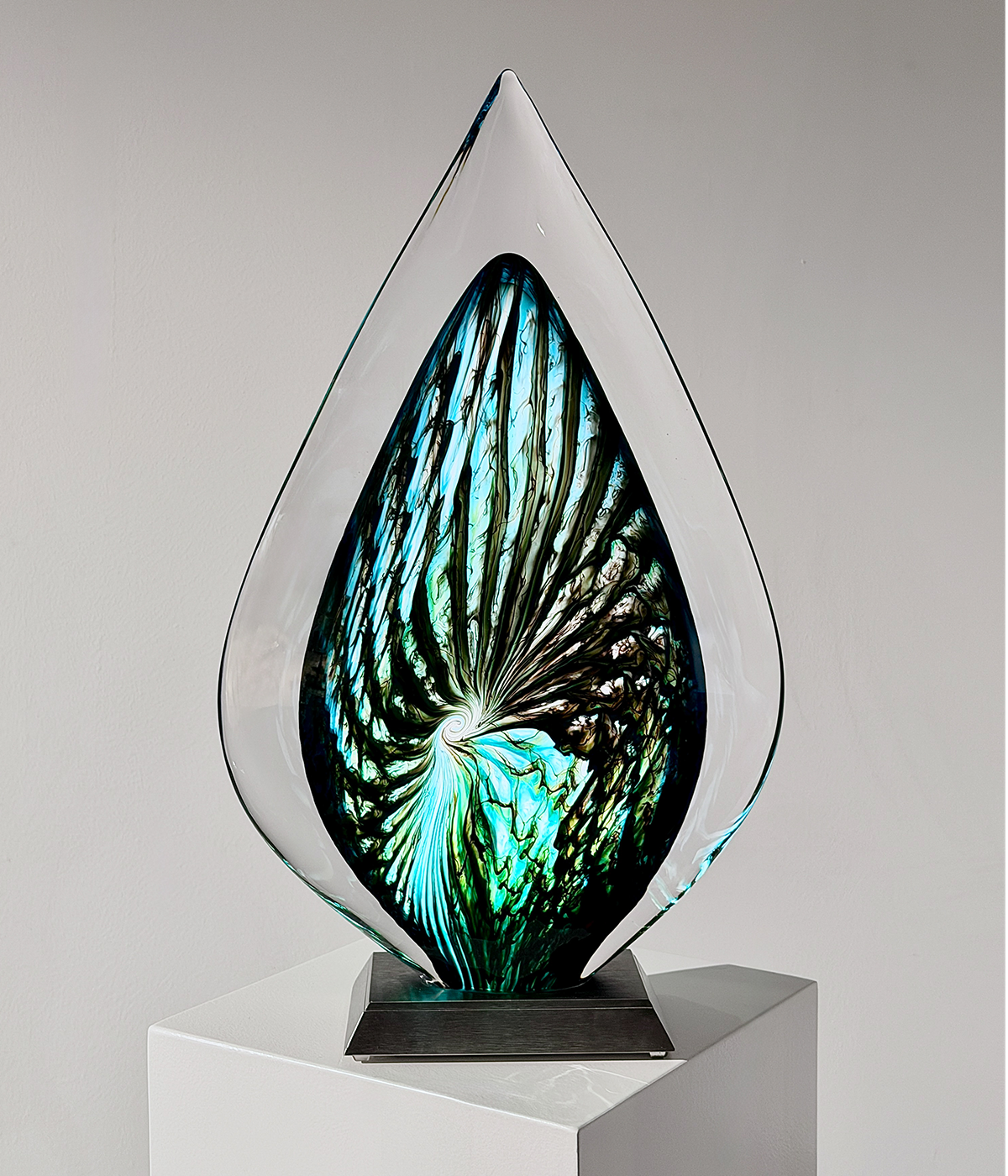 Center-Piece “EMORA“, 2026, Unikat, betitelt, signiert, mundgeblasene Skulptur, (elektrisch) illuminiertes Glaselement, 3-Stufen dimmbar, verbunden mit einem Edelstahlsockel, totale Höhe 56 cm, ca. 14.9 kg, inkl. Echtheits-Zertifikat