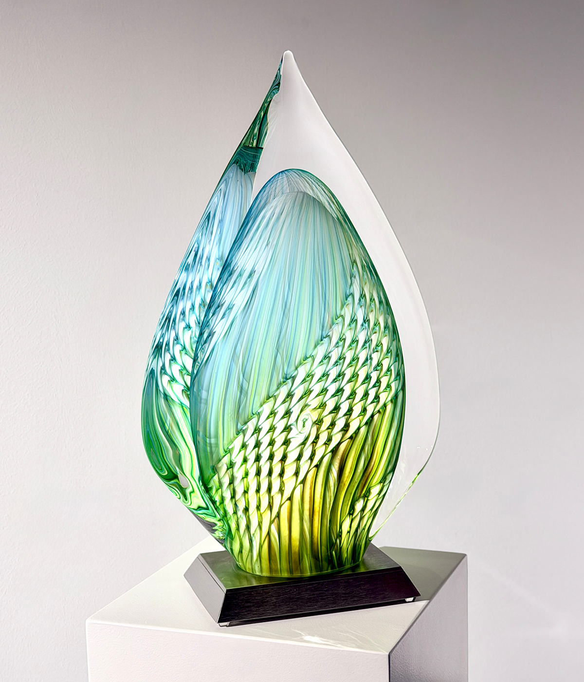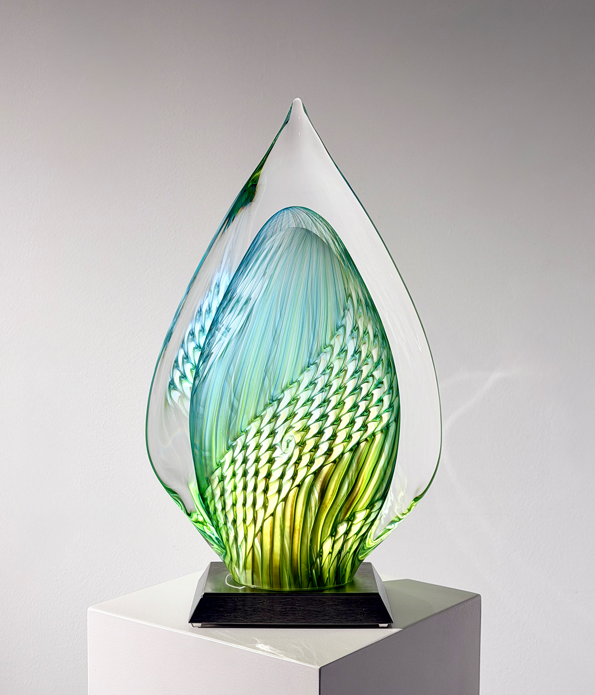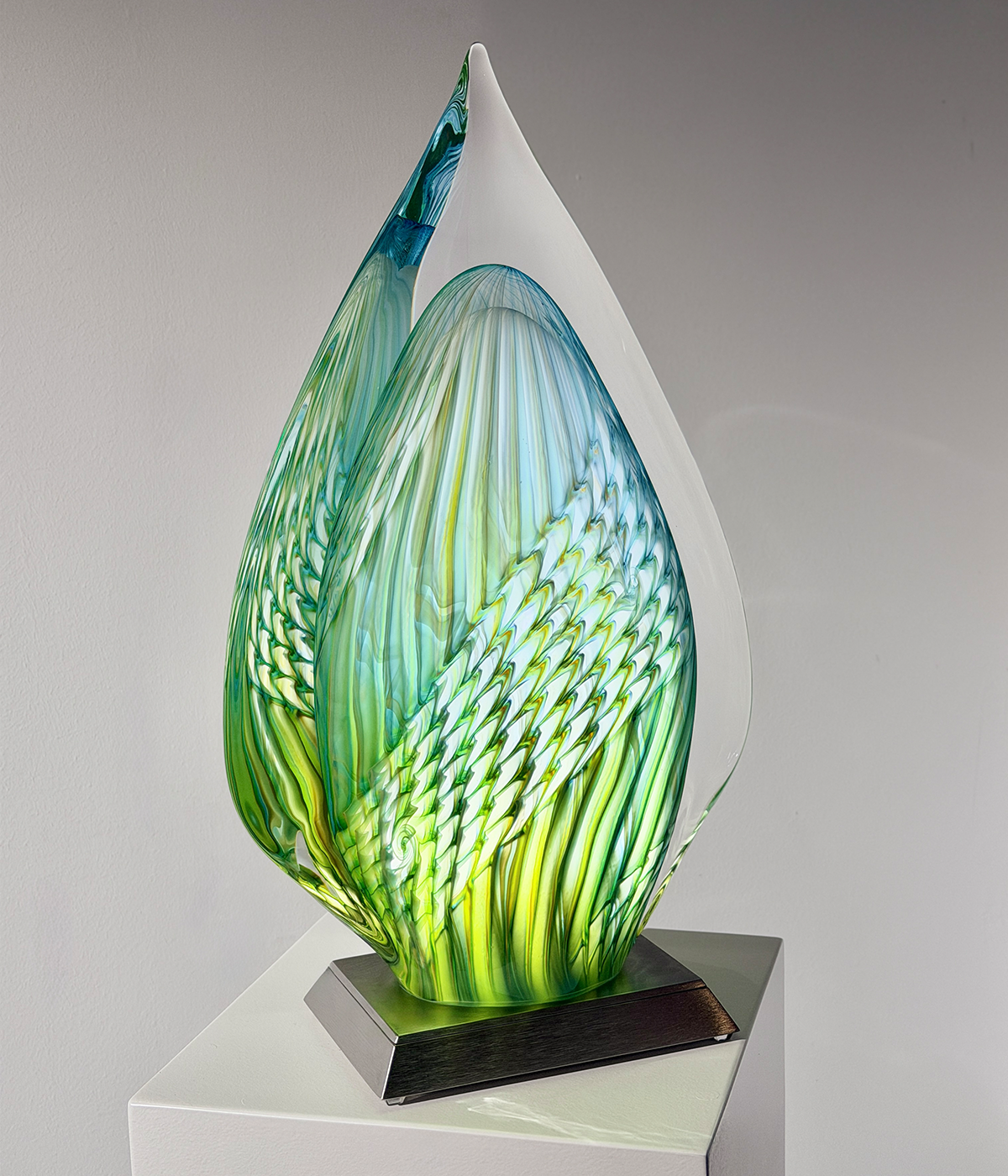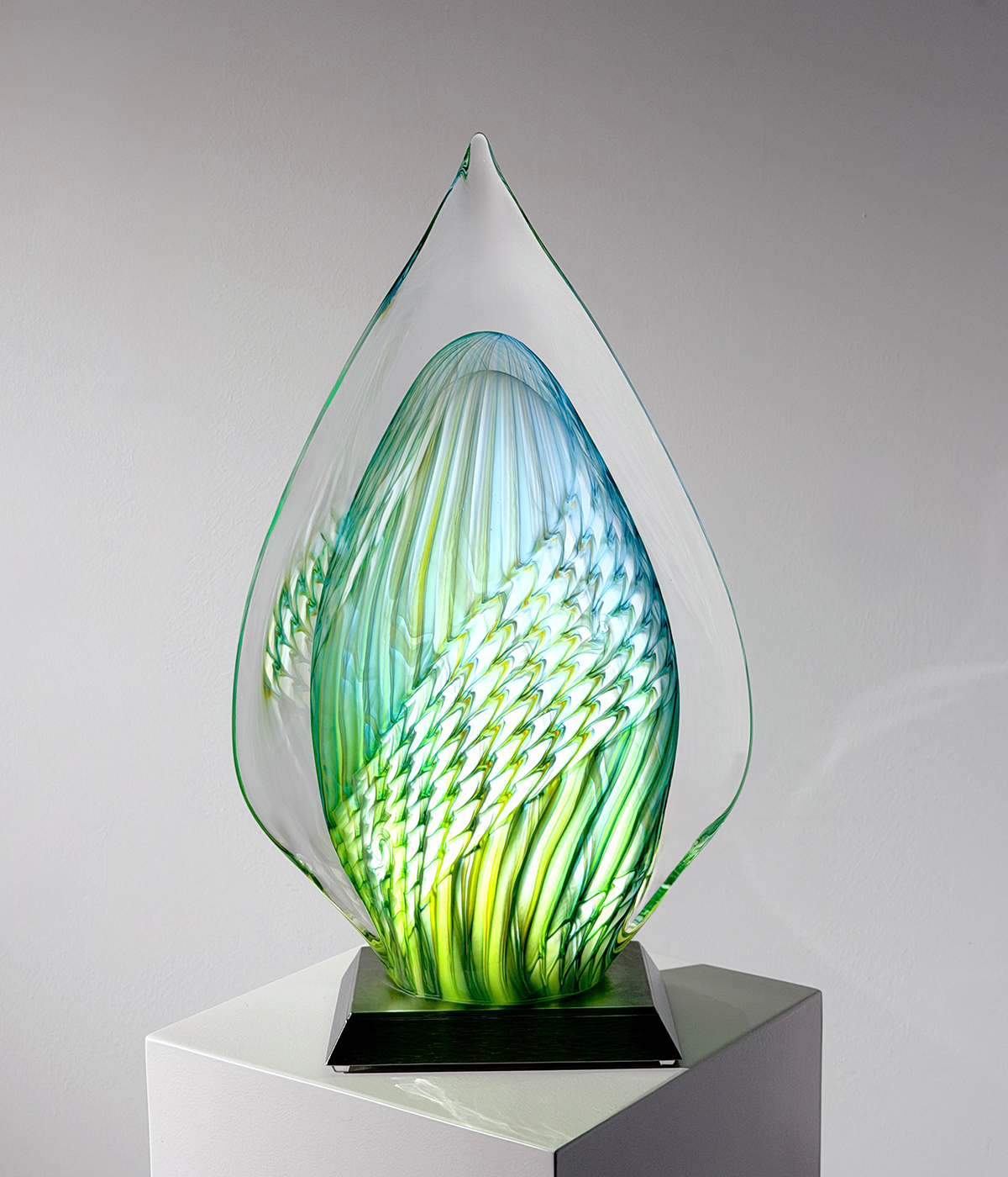 “TELUN“, 2026, Unikat, betitelt, signiert, mundgeblasene Skulptur, (elektrisch) illuminiertes Glaselement, 3-Stufen dimmbar, verbunden mit einem Edelstahlsockel, totale Höhe 53 cm, ca. 13.1 kg, inkl. Echtheits-Zertifikat